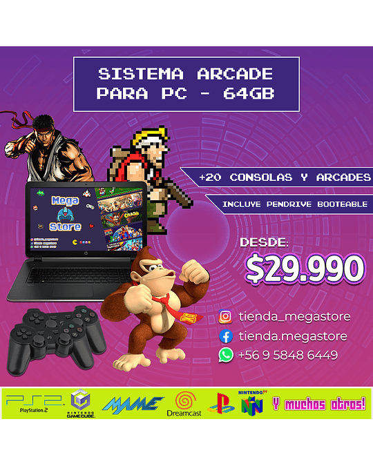 Diviertete con juegos clásicos de grandes consolas como el GameCube, PS2, PS1, Sega Dreamcast, etc. Incluye sagas tales como Super Mario, Sonic, Street Fighter, Mortal Kombat, Pókemon y muchos otros más. El sistema booteable de MegaStore te permite iniciar un entorno de juego totalmente configurado. La mejor colección para usar directamente en tu computadora. Algunas de las consolas que trae son:
